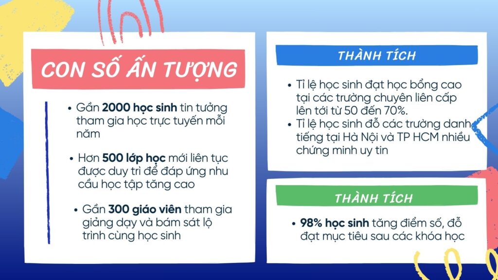 - Gần 2.000 học sinh tin tưởng theo học trực tuyến mỗi năm, cùng 50 lớp học mới liên tục được mở để đáp ứng nhu cầu học tập ngày càng cao.