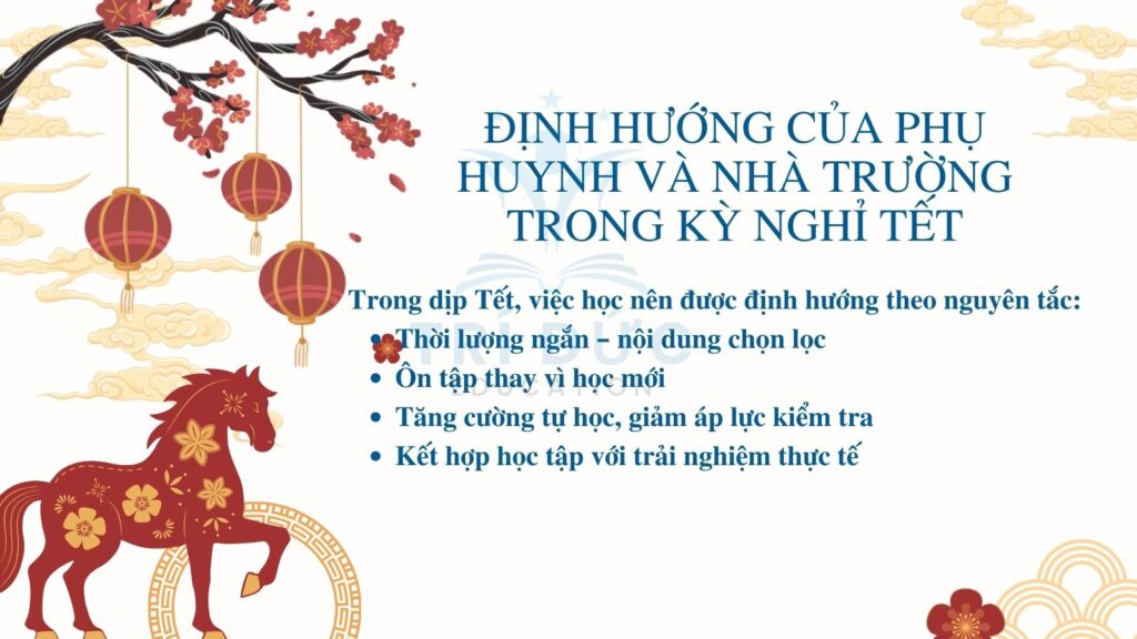 Về phía nhà trường và các trung tâm giáo dục, việc cung cấp tài liệu ôn tập phù hợp, hướng dẫn phương pháp tự học và định hướng rõ mục tiêu học tập trong dịp Tết sẽ giúp phụ huynh và học sinh có cơ sở triển khai việc học một cách hiệu quả. Đây cũng là biểu hiện của trách nhiệm giáo dục toàn diện, hướng tới sự phát triển bền vững của người học.