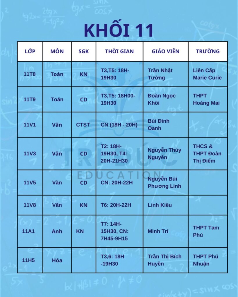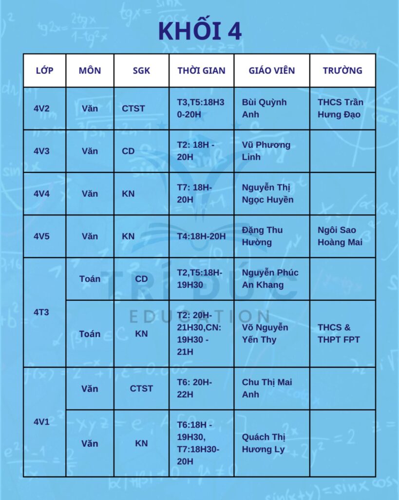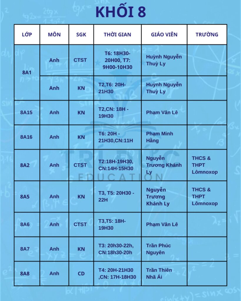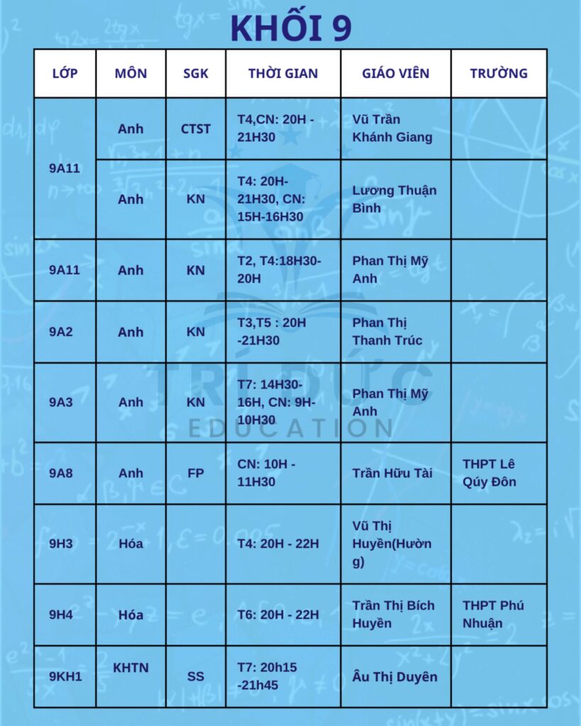 Phụ huynh và học sinh vui lòng theo dõi lịch học chi tiết trong hình ảnh đính kèm, đồng thời chủ động sắp xếp thời gian để tham gia lớp học đầy đủ, đúng giờ. Trong trường hợp có thay đổi hoặc cần hỗ trợ thêm thông tin, trung tâm sẽ cập nhật qua các kênh liên lạc chính thức.