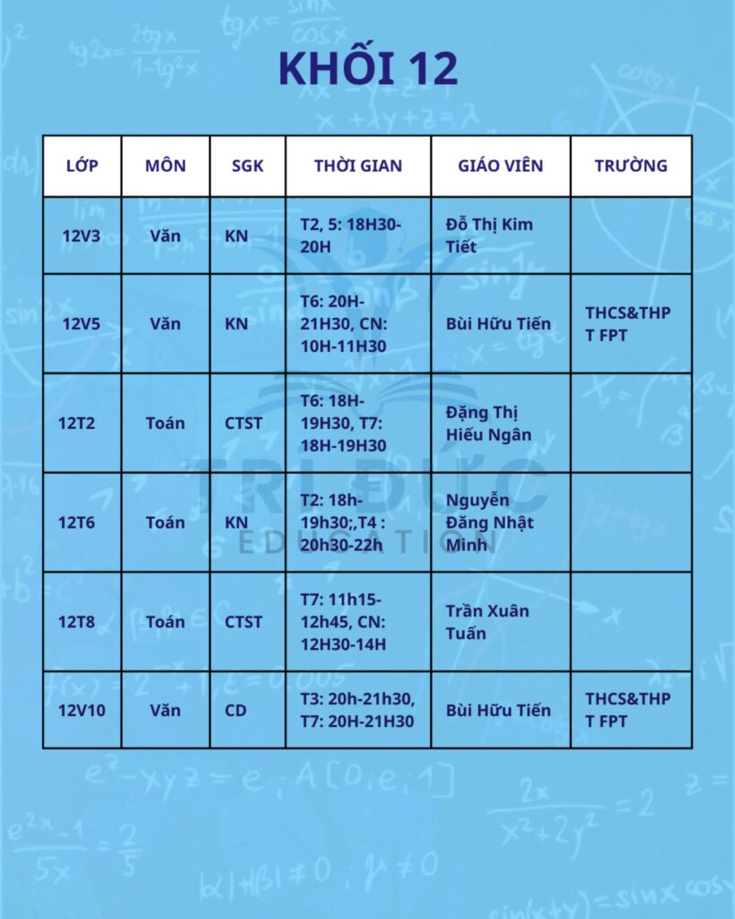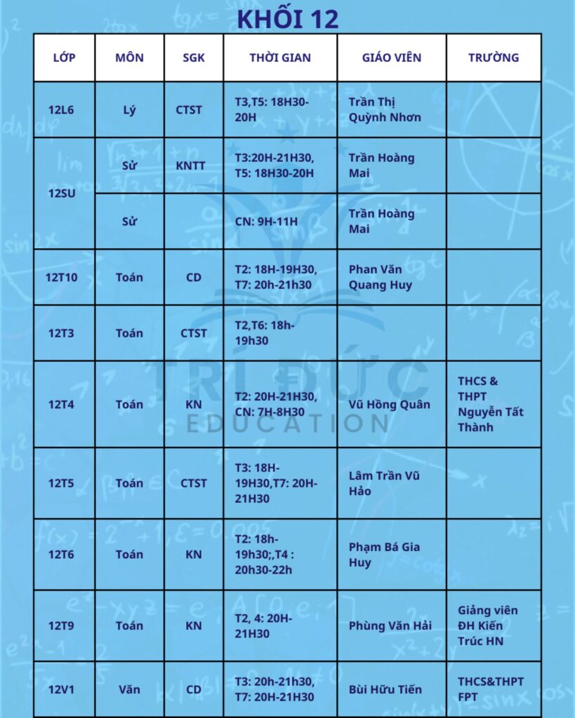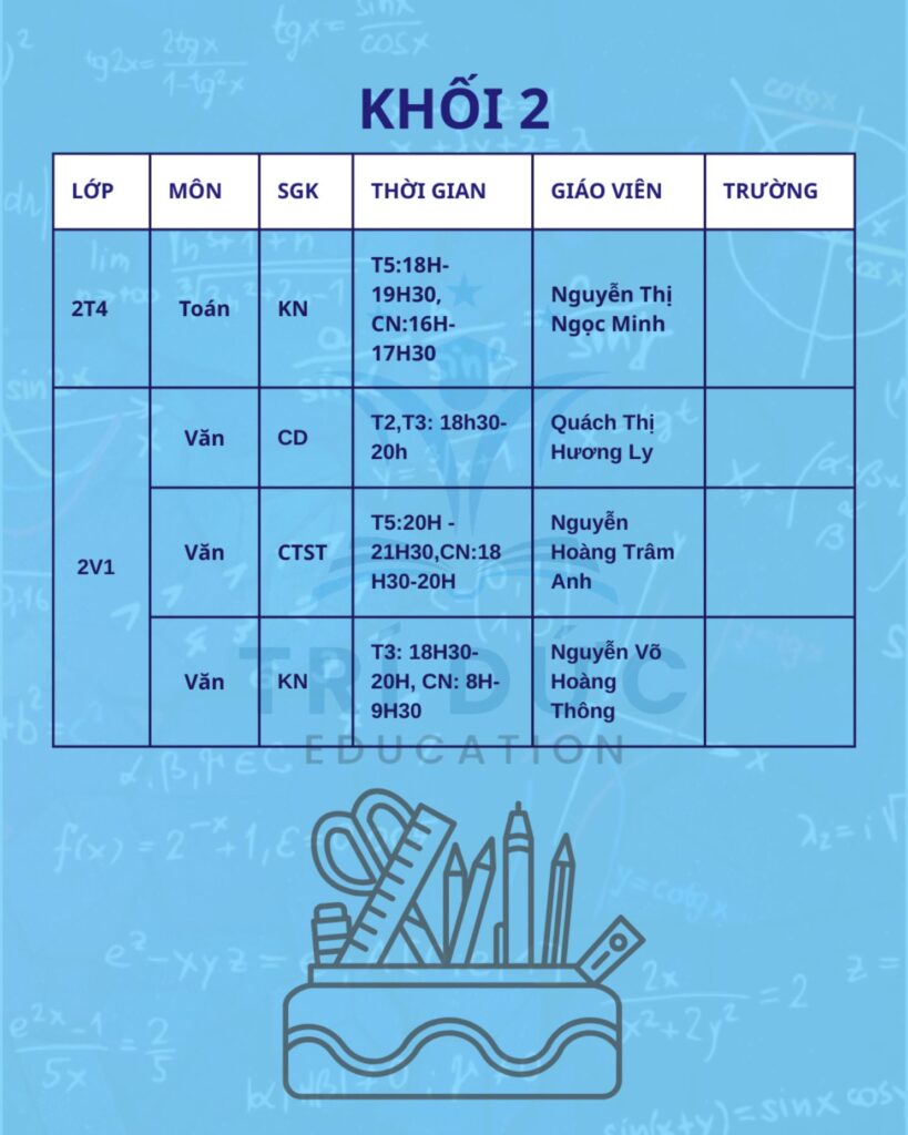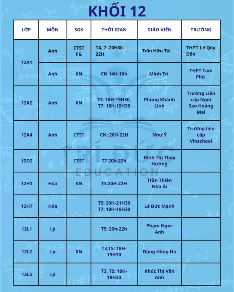 Trí Đức Education trân trọng thông báo lịch học tháng 2 dành cho các khối lớp đang theo học tại trung tâm. Trong tháng này, các lớp học được tổ chức theo kế hoạch đào tạo đã xây dựng từ đầu năm học. Nội dung giảng dạy tập trung ôn tập kiến thức nền tảng, hệ thống lại các chuyên đề quan trọng và từng bước tăng tốc để chuẩn bị cho các bài kiểm tra trong học kỳ II.